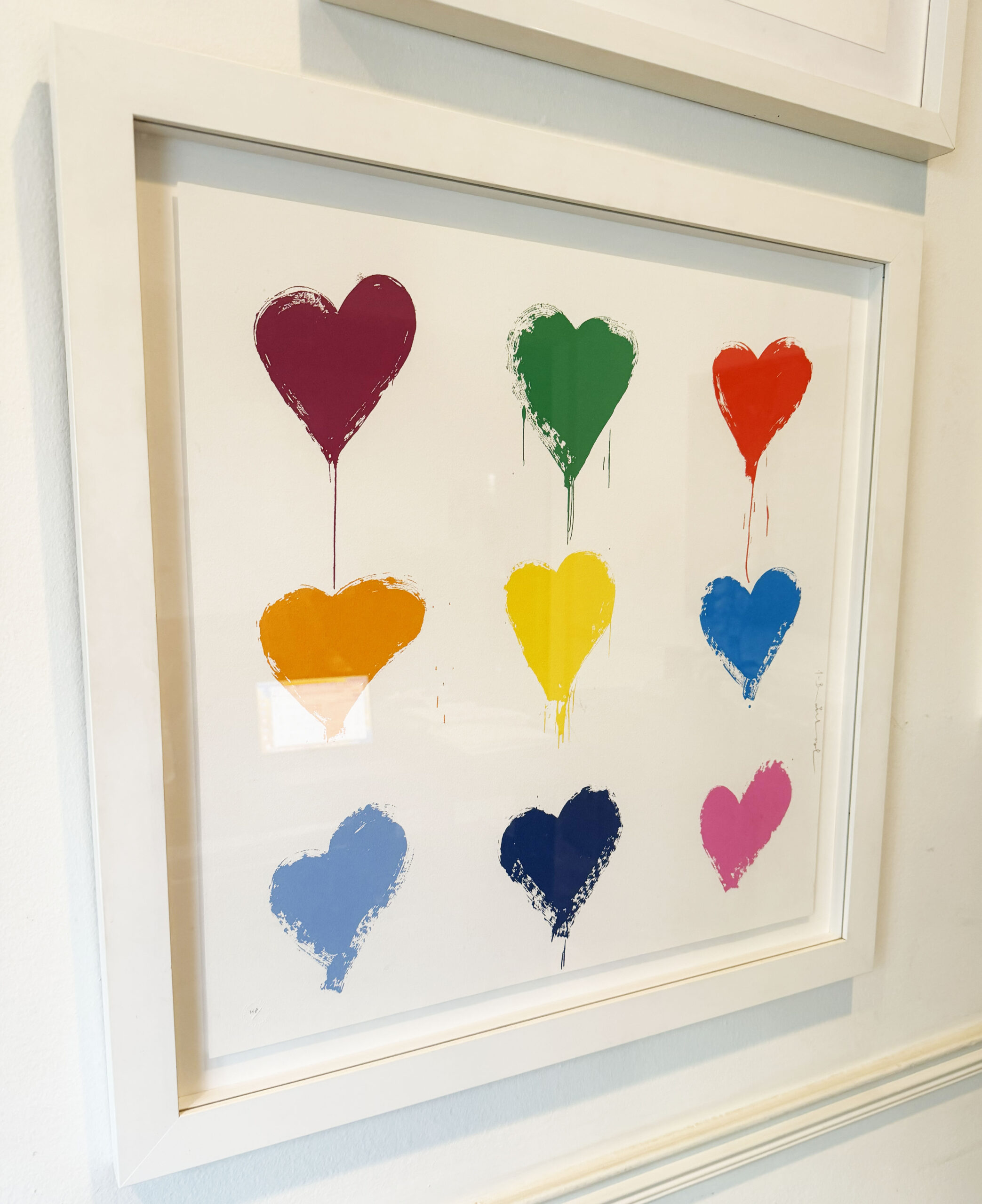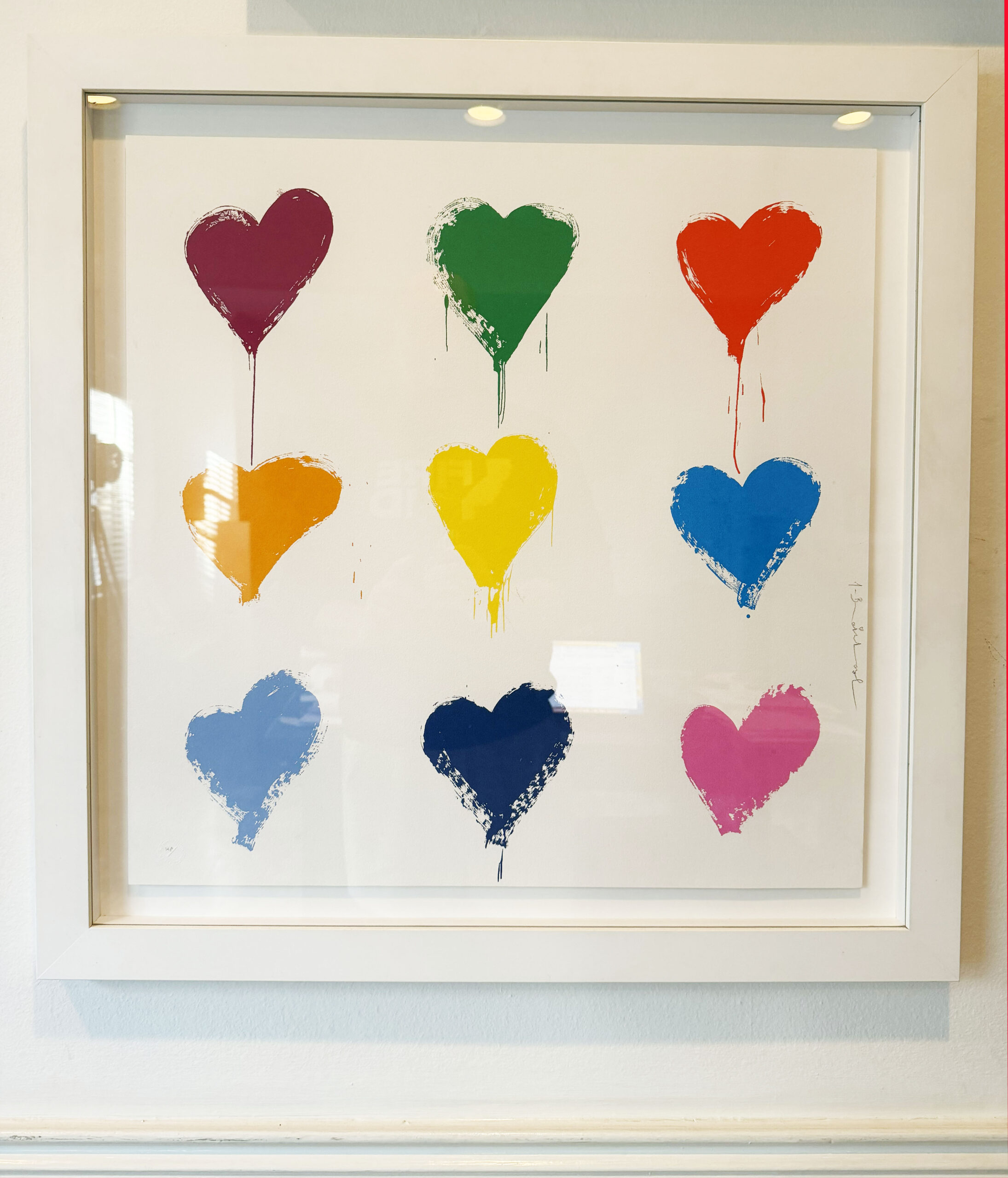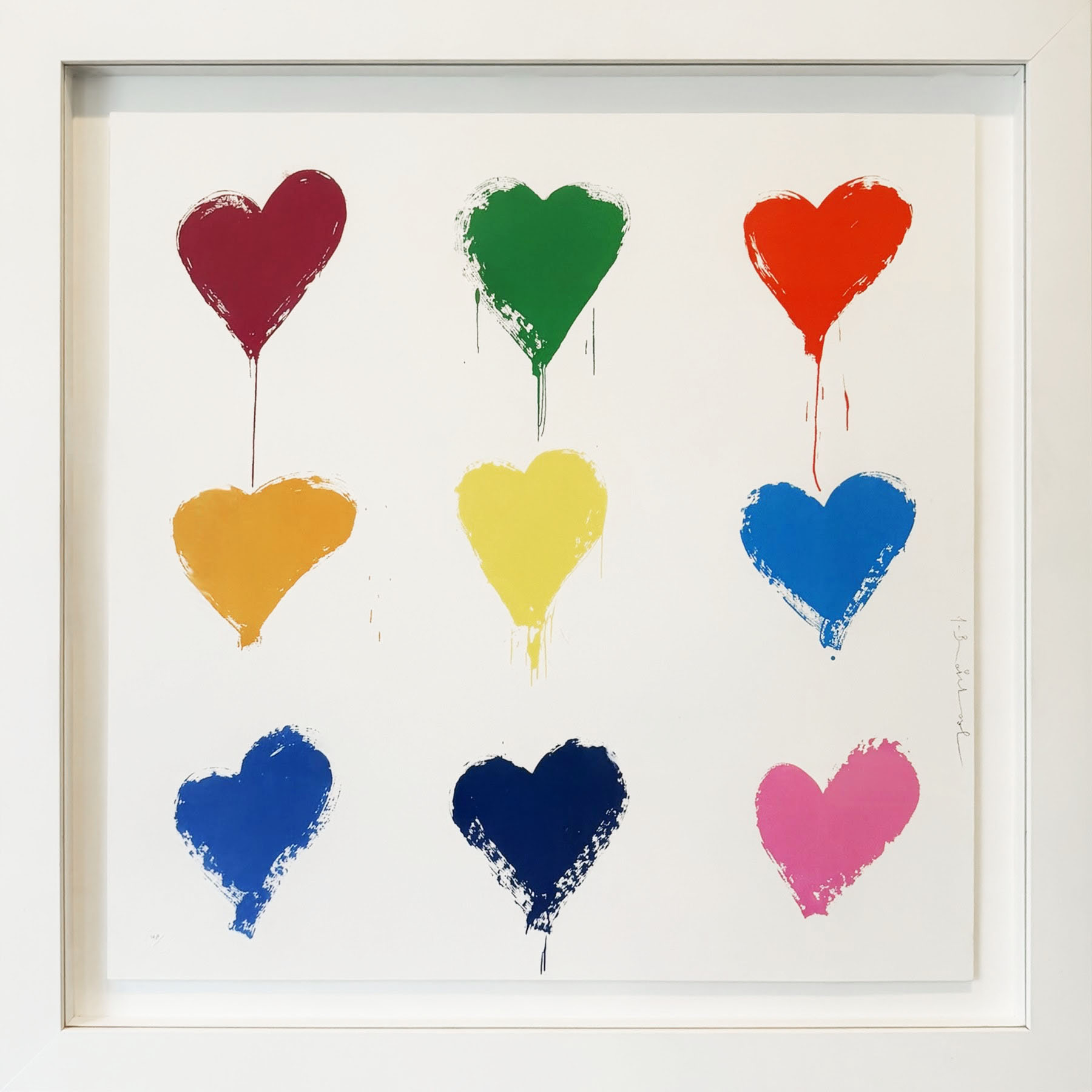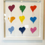 In All You Need is He(art), Mr. Brainwash transforms one of pop culture’s most enduring phrases into a vibrant meditation on optimism, unity, and emotional universality. Arranged in a bold 3 × 3 grid, nine dripping heart motifs—each rendered in a distinct, saturated hue—float against a crisp white ground. The composition is graphic and immediate, yet the expressive paint drips introduce a sense of spontaneity and urban edge that has become synonymous with the artist’s aesthetic.