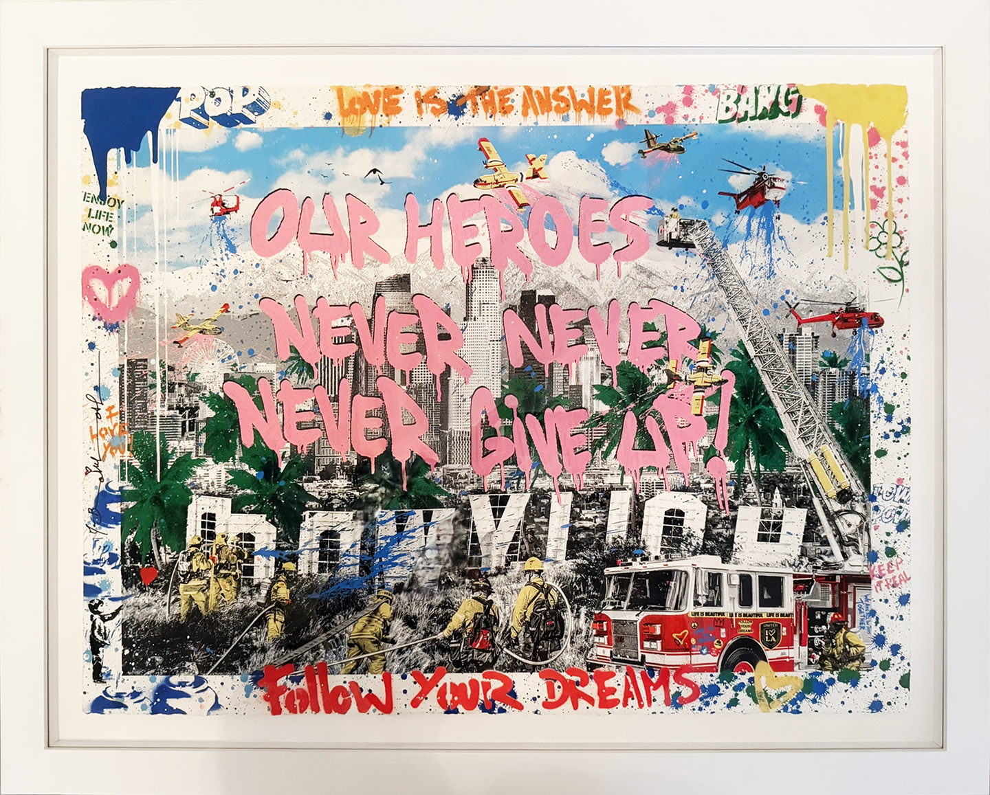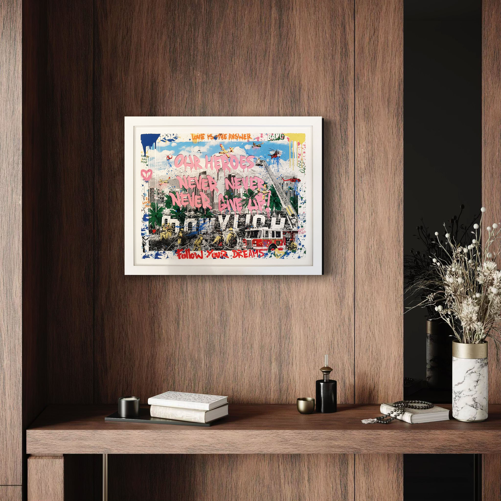 In this one-of-a-kind work, Mr. Brainwash layers silkscreen, stencil, spray paint, and hand-applied acrylic to deliver a message that feels both urgent and optimistic. Firefighters, helicopters, urban fragments, and bold text collide into a familiar yet freshly charged composition—one that speaks to resilience, community, and shared responsibility.