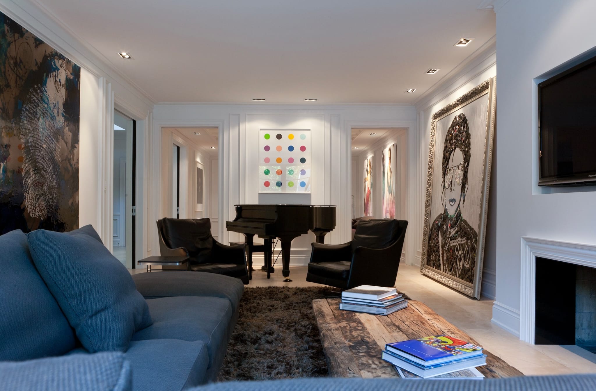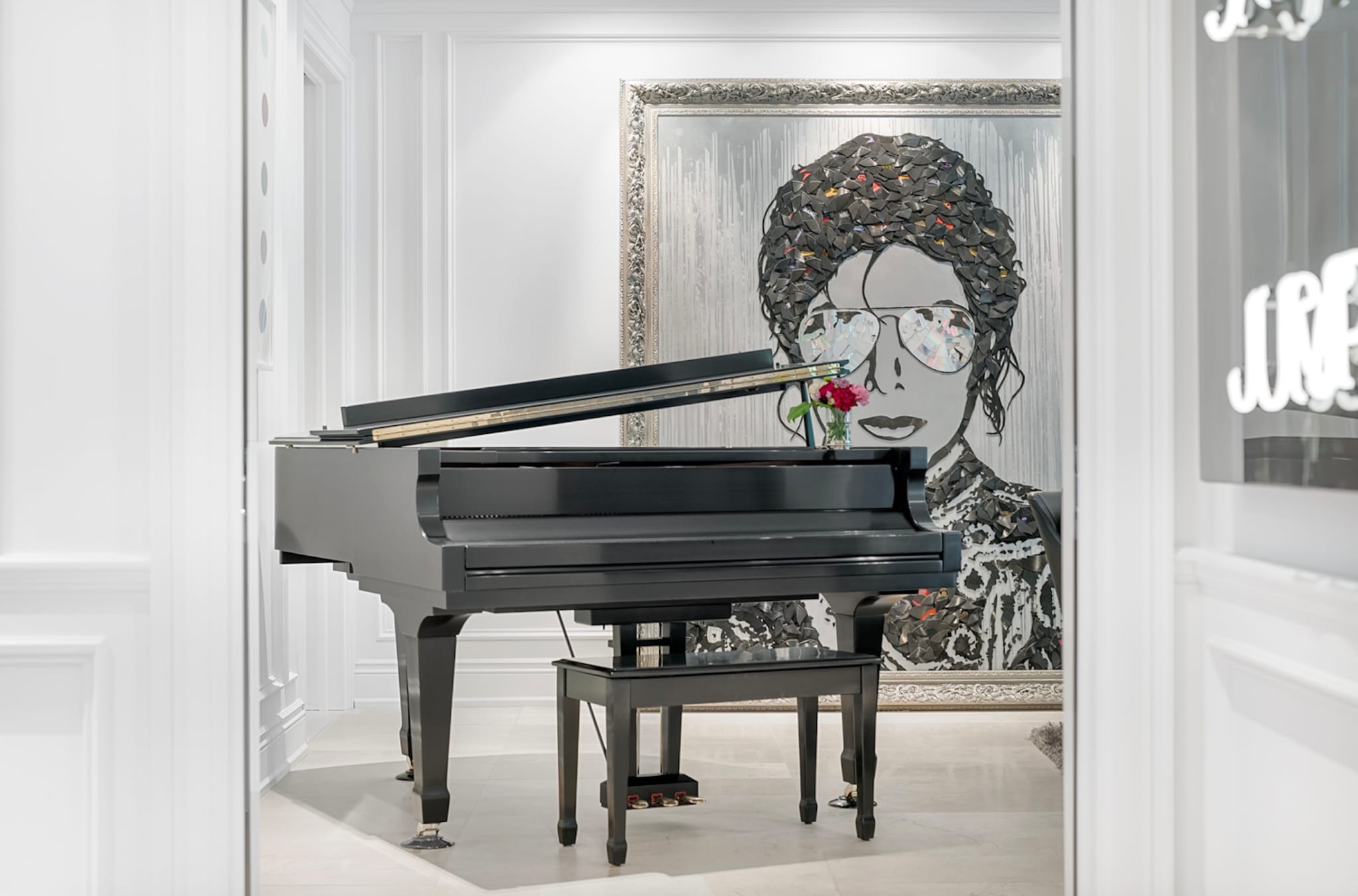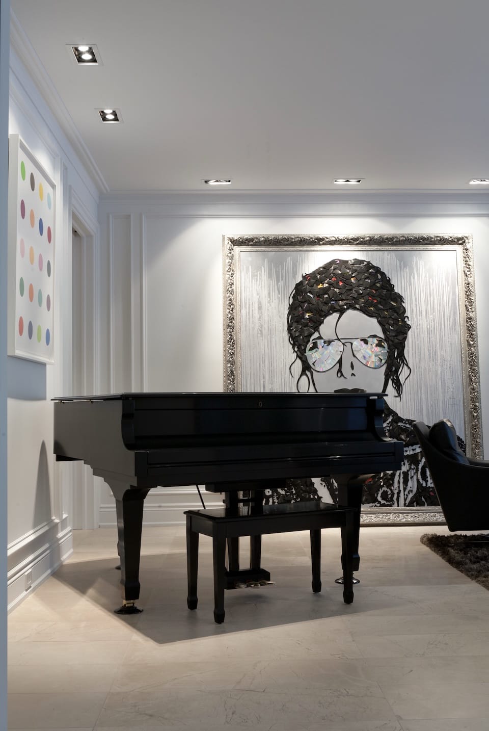 Constructed from shattered vinyl records and reflective compact discs layered with acrylic paint, the work moves beyond traditional painting into sculptural assemblage. Thousands of carefully arranged fragments form Jackson’s unmistakable likeness, while mirrored CD elements embedded within the aviator lenses introduce shifting reflections that activate the work as viewers move through space.