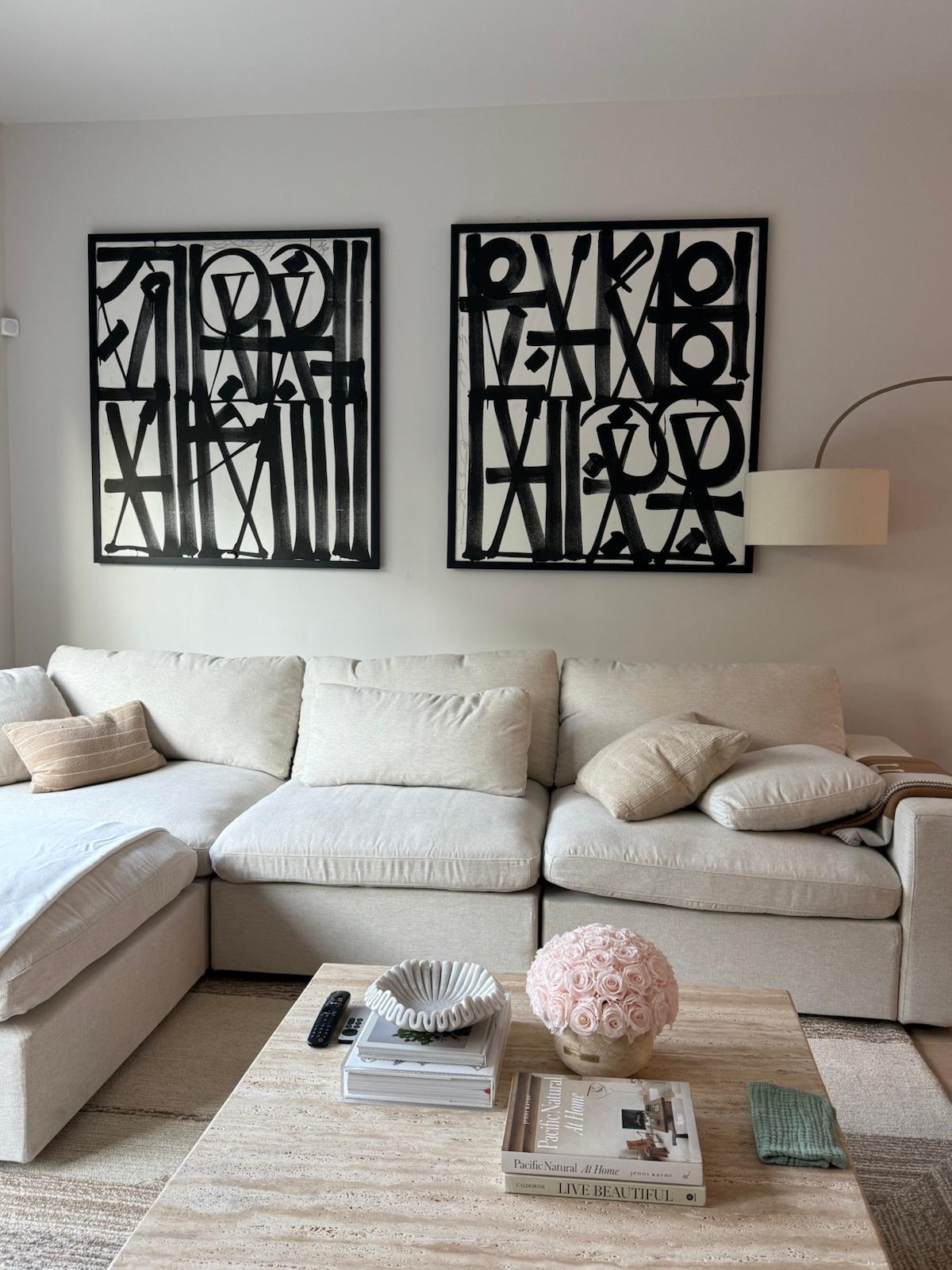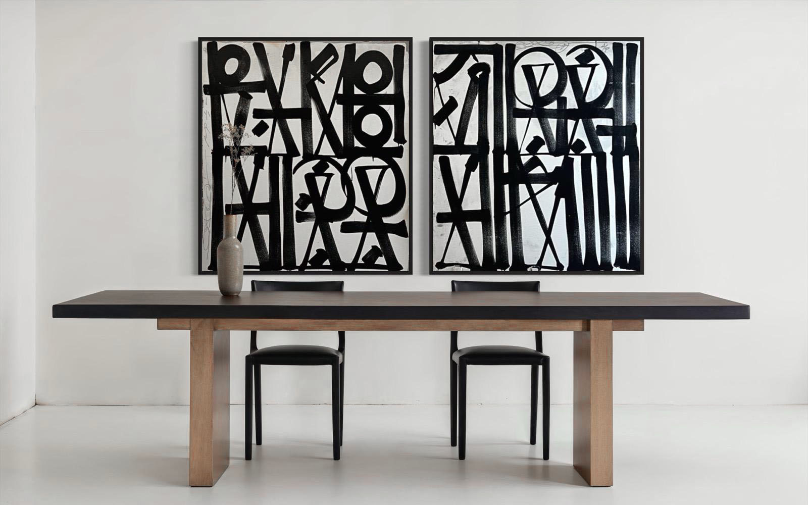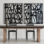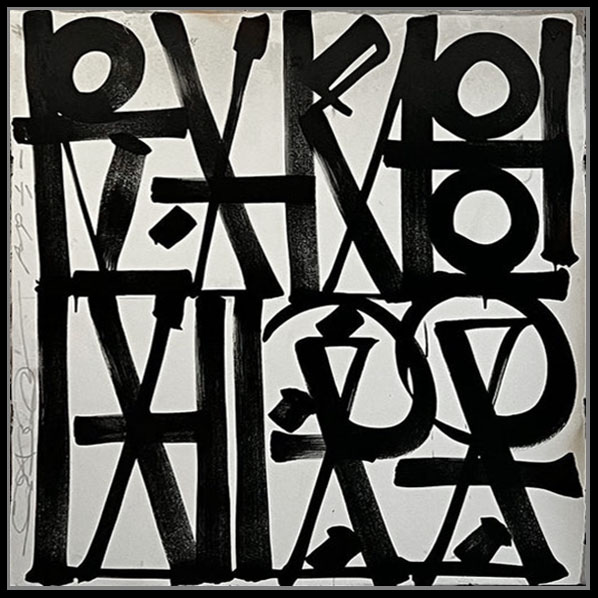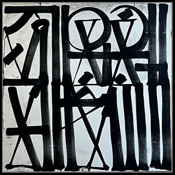These two original paintings from RETNA’s Untitled Pair (2016) exemplify the artist’s distinctive calligraphic language at a moment when his visual lexicon had achieved full maturity and global recognition. Executed in dense layers of black acrylic over white grounds, the paintings function as twin totems, each balancing rhythm, geometry, and gesture with the precision of ancient script. RETNA’s hieroglyphic forms are not literal words, but symbols of communication itself, fusing influences from Arabic, Hebrew, Asian, and Latin typography into an urban codex that oscillates between the sacred and the street. In 2016, RETNA was expanding beyond his Los Angeles origins into major international exhibitions and collaborations (including with Louis Vuitton and contemporary mural commissions), refining his palette and compositional restraint. These canvases reflect that evolution: stark, architectural, and meditative, they translate the energy of graffiti into a language of abstraction, where repetition becomes ritual and mark-making becomes mantra. As a pair, they form a dialogue, two panels in conversation, unified yet distinct, embodying RETNA’s mastery of scale, movement, and symbolic rhythm.
