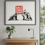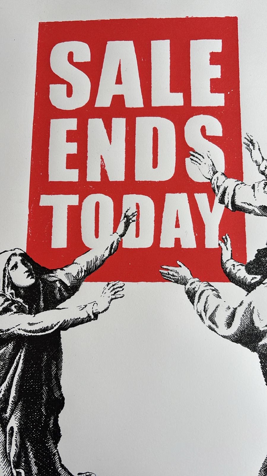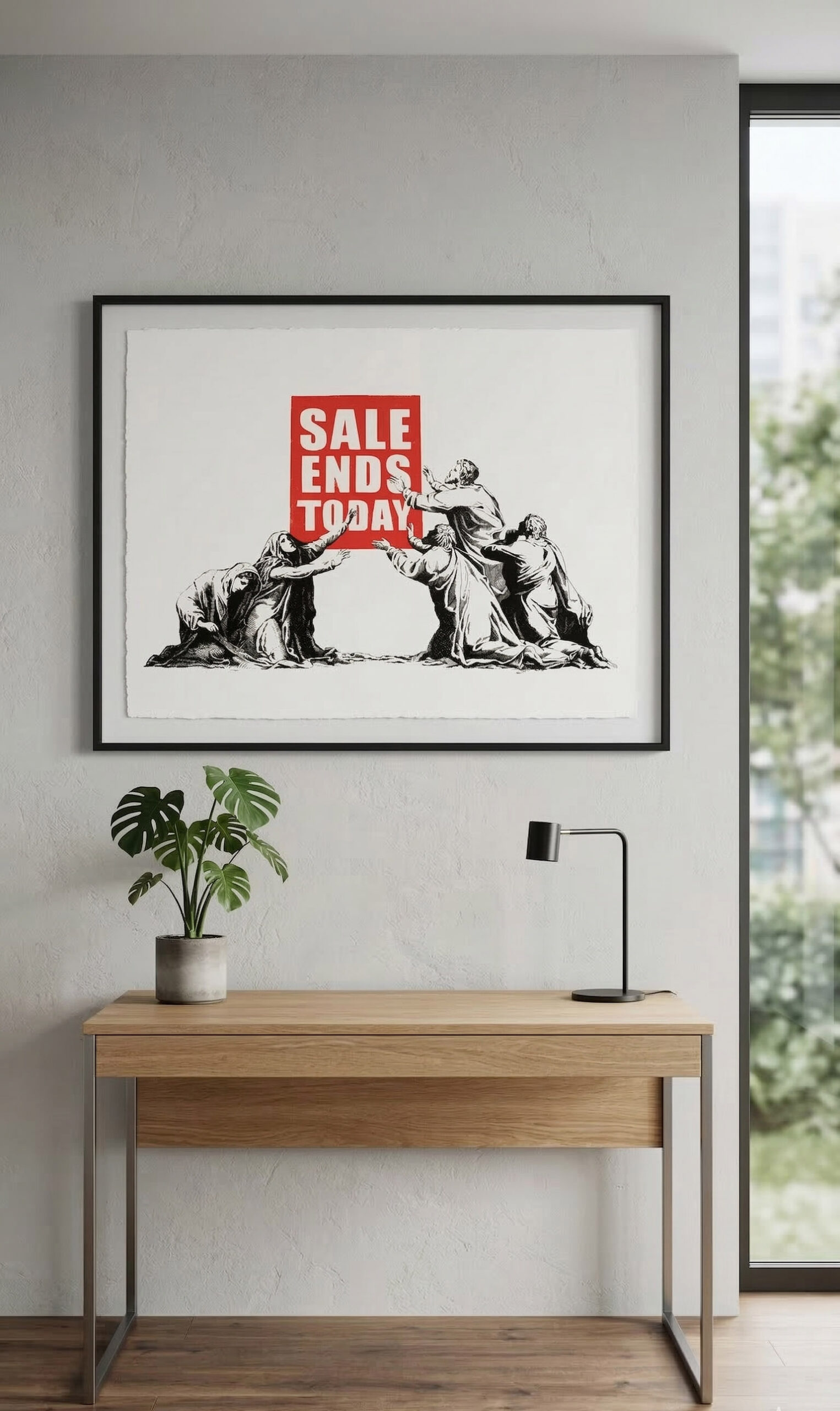 One of the most intellectually engaging prints by Banksy, Sale Ends (v.2) (2017) transforms a dramatic religious composition into a sharp critique of modern consumer culture. Adapted from a 19th-century engraving by Gustave Doré, the work depicts figures reaching in reverence toward a bold red sign reading “SALE ENDS TODAY,” replacing the traditional sacred subject with a symbol of retail urgency.
