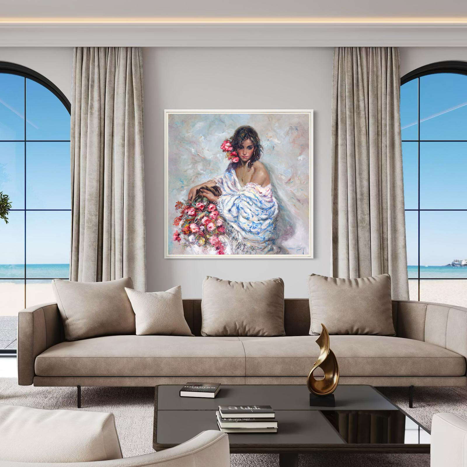 Painted circa 2010–2011, this work belongs to José Royo’s mature period, when his painting achieved its most lyrical balance between impressionistic brushwork and classical Spanish subject matter. Royo is celebrated for his poetic depictions of women enveloped in light, fabric, and flowers, motifs that echo the romantic traditions of Sorolla and Spanish figurative painting while remaining unmistakably contemporary. In this composition, the model emerges from a soft atmospheric field, her flowing shawl and bouquet rendered with sweeping strokes of color that convey both movement and intimacy. Works from this period exemplify the painter’s enduring fascination with feminine elegance, Mediterranean light, and the sensual beauty of everyday moments.