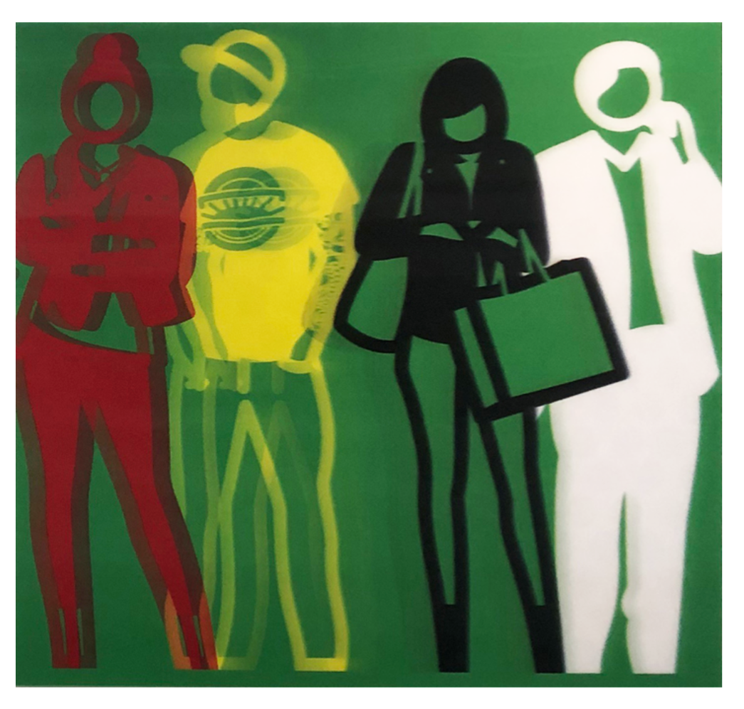 This lenticular panel is a compelling example of Julian Opie’s Standing People imagery, a body of work that distills the human figure into its most essential graphic form. Using crisp outlines, flat color fields, and the optical movement inherent to lenticular technology, Opie activates the surface so the figure subtly shifts as the viewer moves.