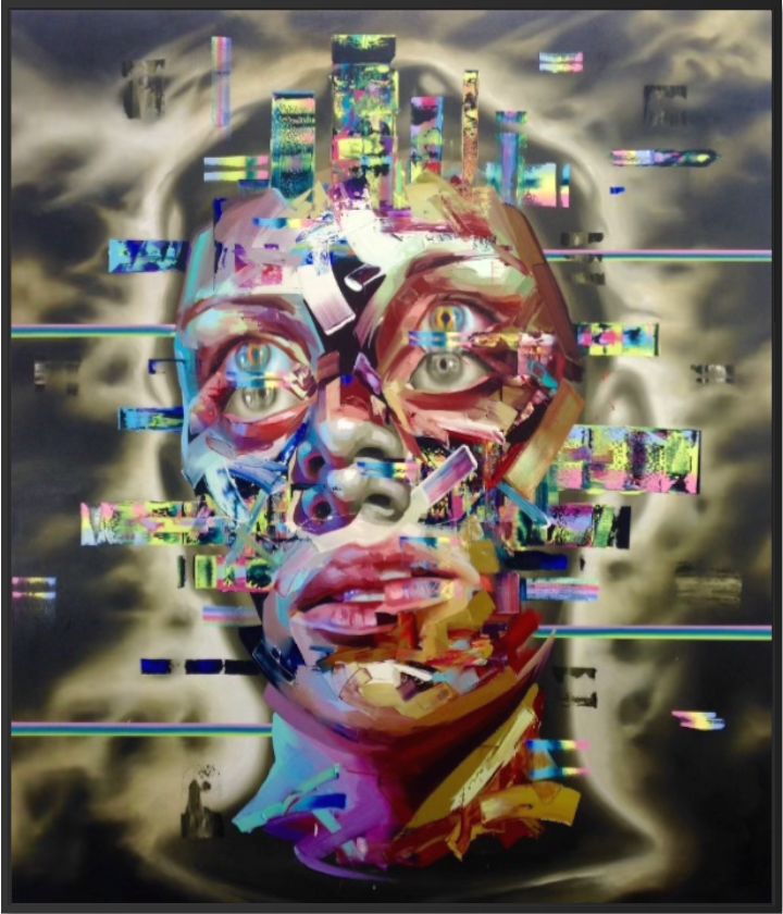 Bower merges classical oil painting techniques with visual language borrowed from compression errors, neural imaging, and digital glitches. Layers fracture, duplicate, and dissolve across the surface, creating a psychological portrait that oscillates between humanity and machine perception. The subject feels both intensely present and algorithmically disassembled, reflecting contemporary anxieties surrounding surveillance, artificial intelligence, and the erosion of stable identity.