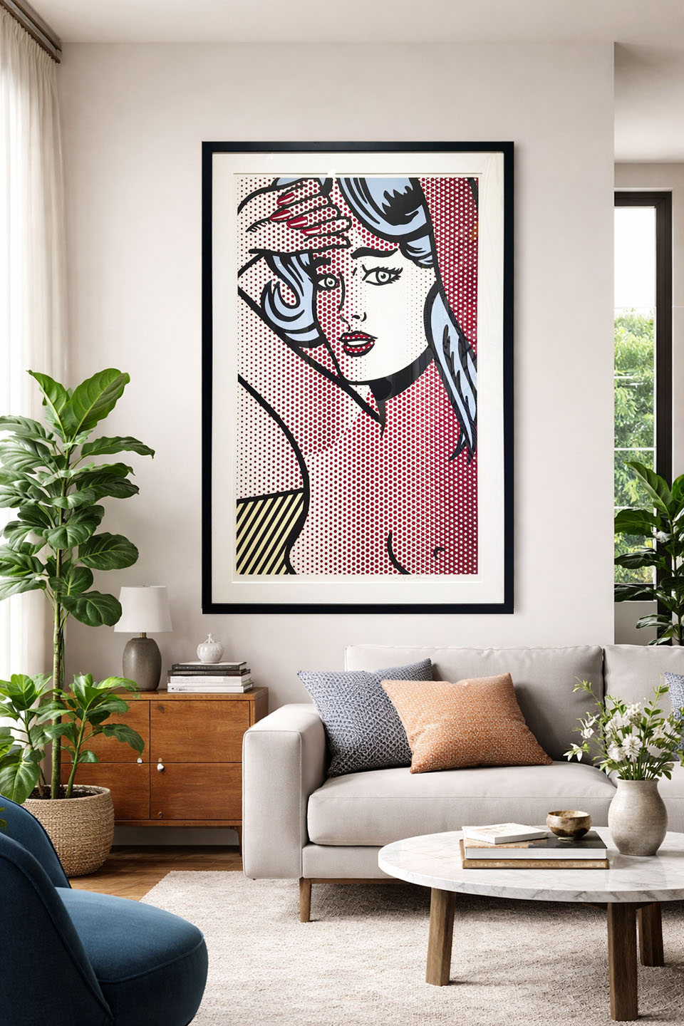 Here, Lichtenstein distills the female figure to its essential elements—line, color, and pattern—while amplifying emotional presence. The blue hair, a bold and unnatural choice, becomes both a compositional anchor and a psychological cue. It signals that we are not looking at a person, but at an image of a person—constructed, stylized, and mediated.