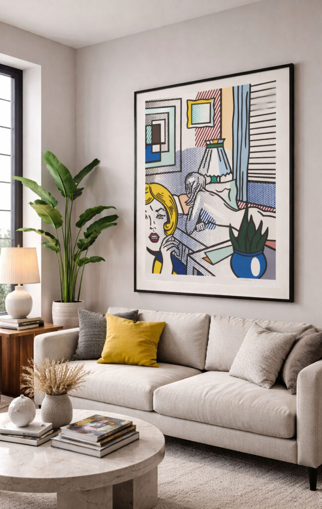 Roommates is among the most ambitious compositions in the series. At nearly five feet tall, its scale alone sets it apart from most of Lichtenstein’s printed output. But it is the structure of the image that makes it exceptional.