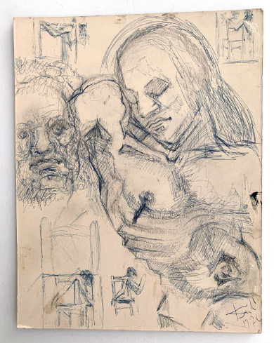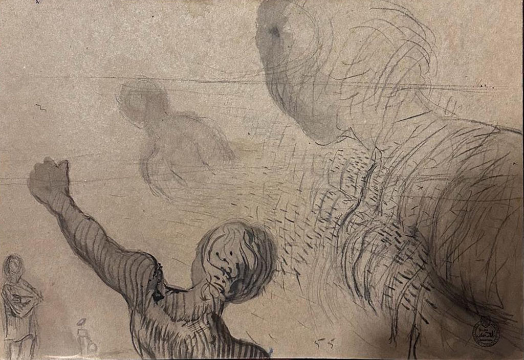 A bold, energetic sketch alive with movement and psychological tension. Dalí’s quick strokes suggest figures in flux, wrestling between figuration and abstraction—an artist at the height of his powers, experimenting freely.