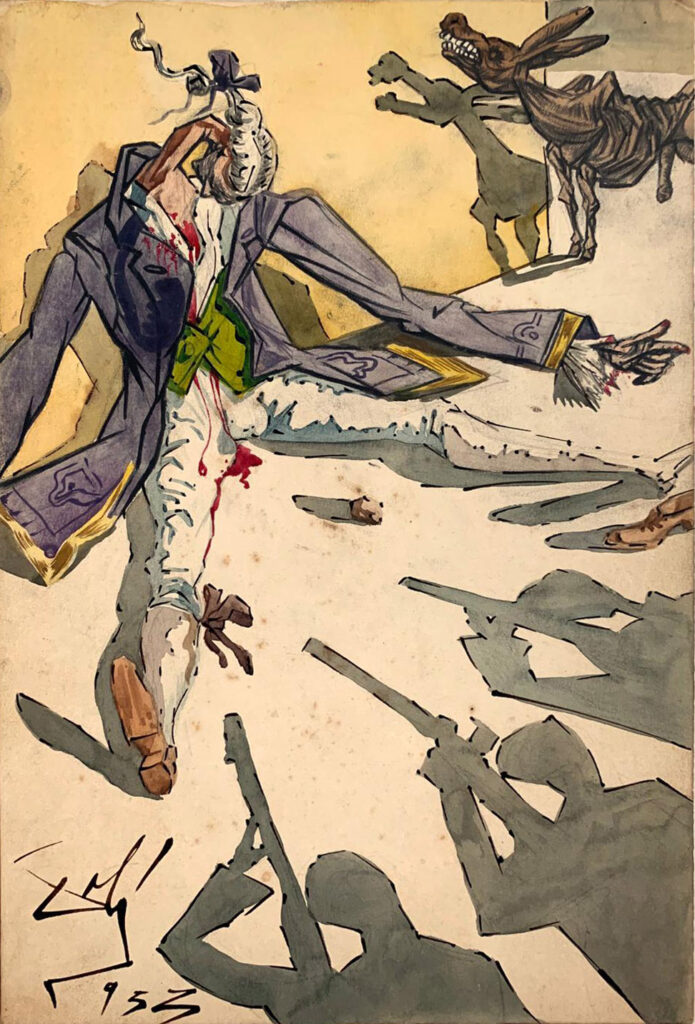 Like Goya, Dalí transforms national trauma into universal allegory. Violence, absurdity, and mortality collide on a single sheet of cardboard. What Goya did with oil and shadow, Dalí accomplishes here with gouache, ink, and imagination.