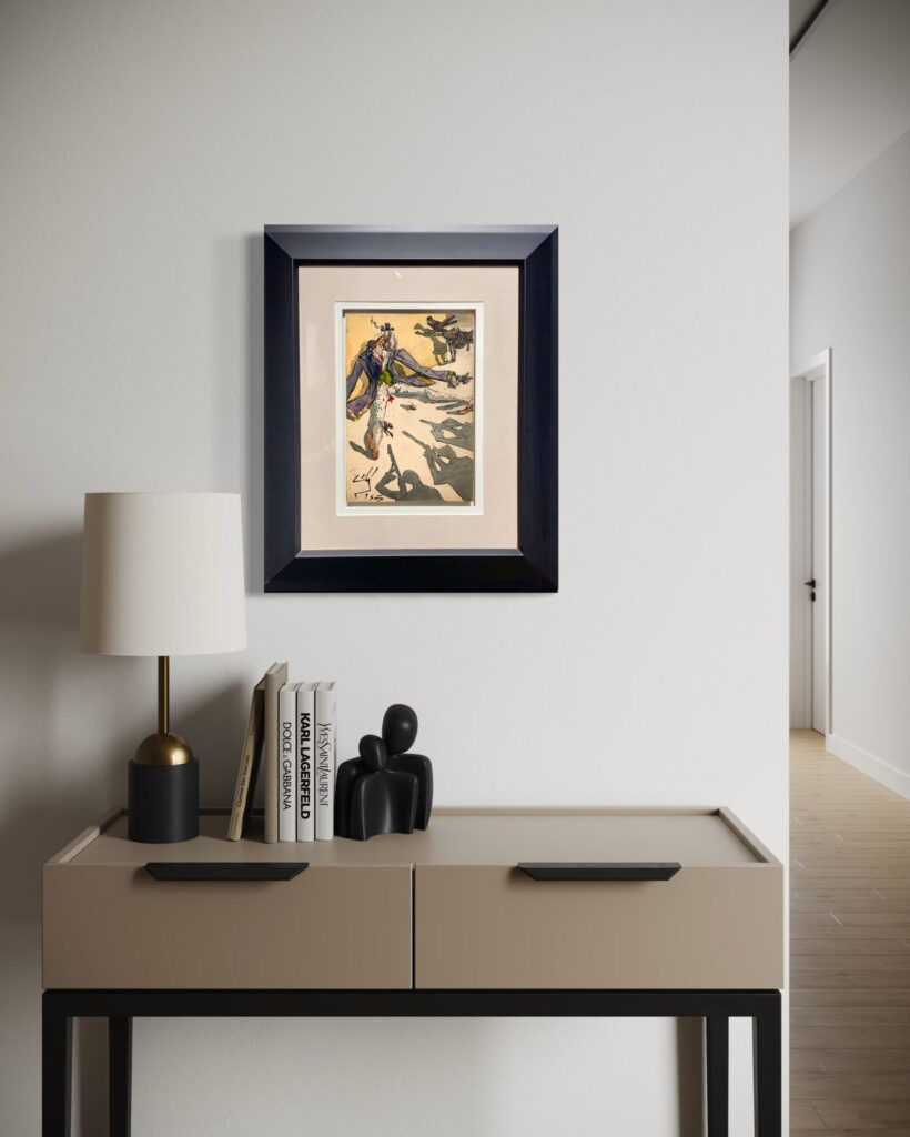Playful and theatrical, this watercolor was an original maquette for Le Tricorne, the famed ballet based on Pedro de Alarcón’s novella. Dalí’s wit shines through—the butterfly, the masked figure—turning narrative into visual poetry.